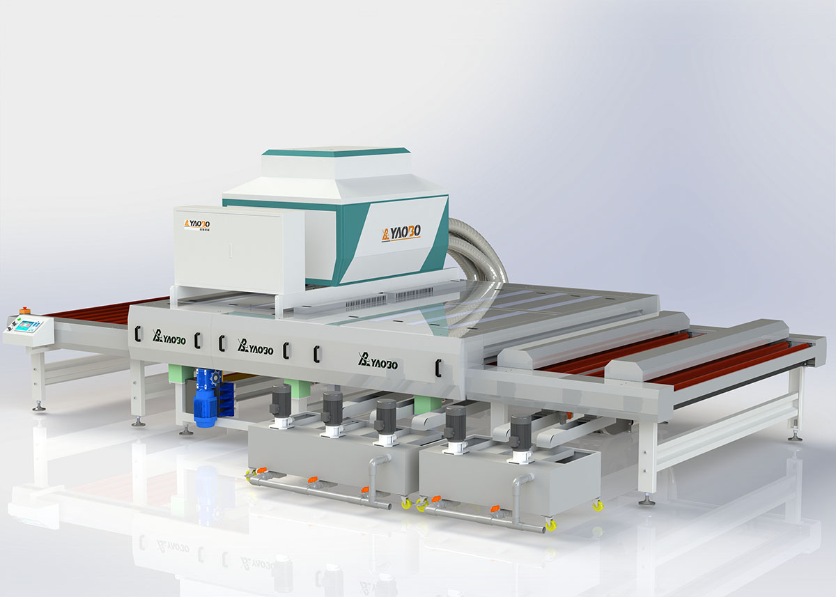 用于匹配雙邊磨使用;進片段有兩道預噴淋,減少帶入主機的玻璃粉,減少玻璃粉對設(shè)備的腐蝕,延長設(shè)備使用壽命;PLC控制系統(tǒng),配有編碼器等傳感器,可通過設(shè)置相應(yīng)的厚度和速度,控制系統(tǒng)可自動控制;水路部分有多重過濾,盡可能的保持噴淋到玻璃表面的水的潔凈度;噴淋管安裝有大量噴頭,噴頭型號為9515,噴射出的水為扇形,可有效覆蓋全部玻璃,無死角,且噴頭口較大,不易被玻璃粉及其他污染物堵塞;毛刷電機使用減速機,輸出扭矩大,避免小皮帶輪帶動大皮帶輪,減少傳動皮帶的打滑和磨損,延長皮帶使用壽命;毛刷材質(zhì)為尼龍絲材質(zhì),轉(zhuǎn)速500r/min,能更有效的清潔玻璃表面污染物;一道上毛刷材質(zhì)為尼龍0.08mm的,清洗LOW-E玻璃時使用且不劃傷膜層;配備有3對風刀,風刀使用鋁合金一次成型,變形小,刀口均勻誤差小,保證刀口間隙誤差小于±0.2mm,更好的吹干玻璃;風機箱以及電柜均安裝在設(shè)備上架上方,能更有效的節(jié)約廠房空